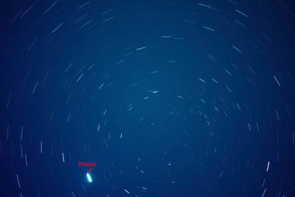 This demonstrates just how far Polaris is from the true celestial pole. Canon 350D, 500mm lens, 20 minute exposure, field of view about 2.6 degrees