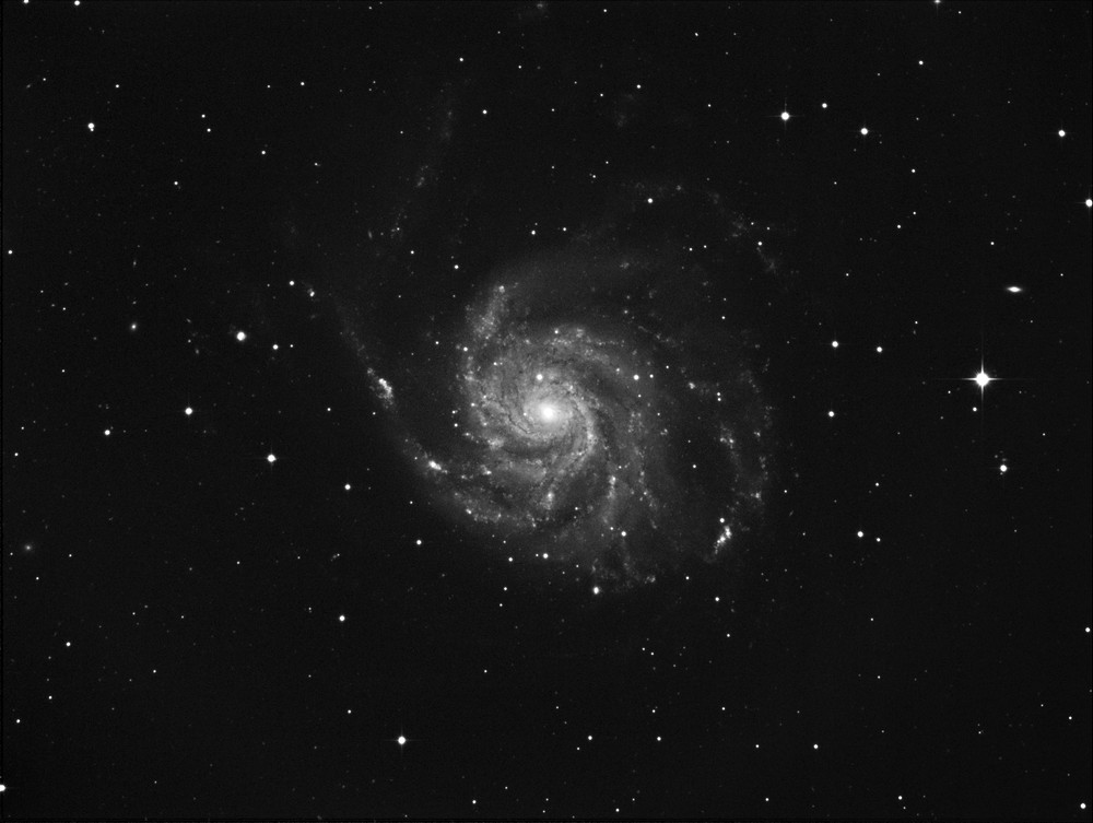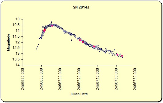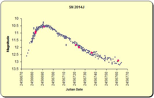 14th AprilMoon Using OIII filter![]() Supernova in M82 Magnitude recorded as 12.757 A bright Moon (pictured above) introduced errors. ![]() April 18th I realised that I had determined the magnitude without adjusting the measuring circle to fit the size of the supernova. This would have introduced an error. A recalculation gave the magnitude as 12.928 ![]() 18th April M82 supernova. This time I only used reference stars with magnitudes close to that of the supernova. I also reworked the data from 14th April. The magnitude was 13.200 ![]() The Moon rose quite late so I grabbed some luminance frames of M101 6x 10 minutes ![]() |