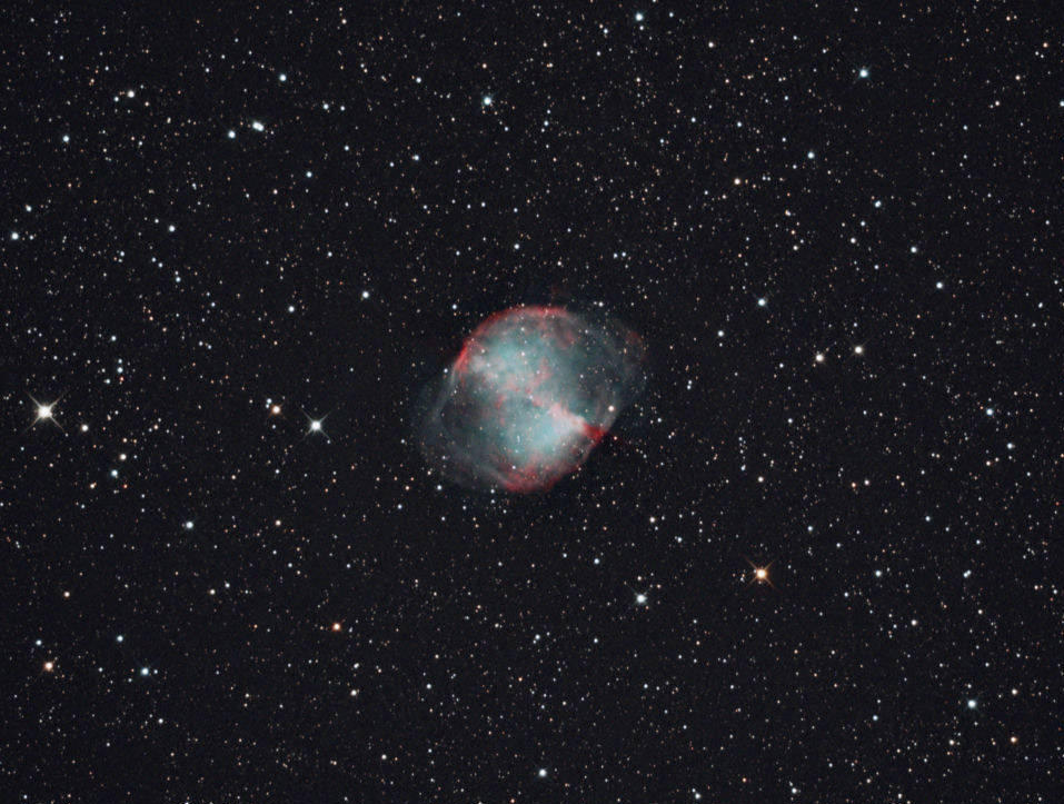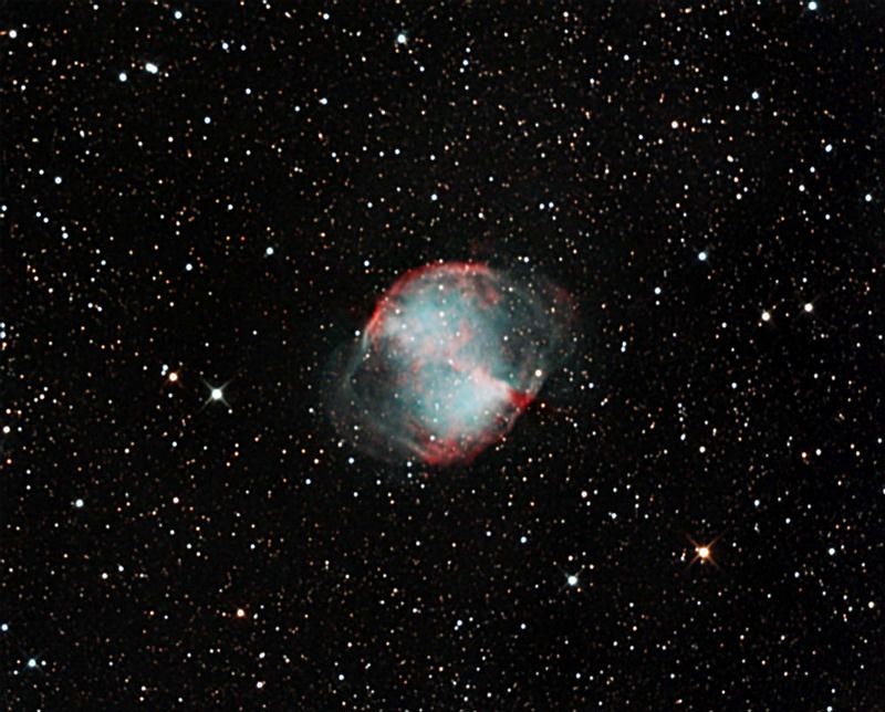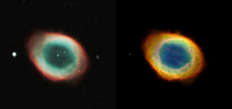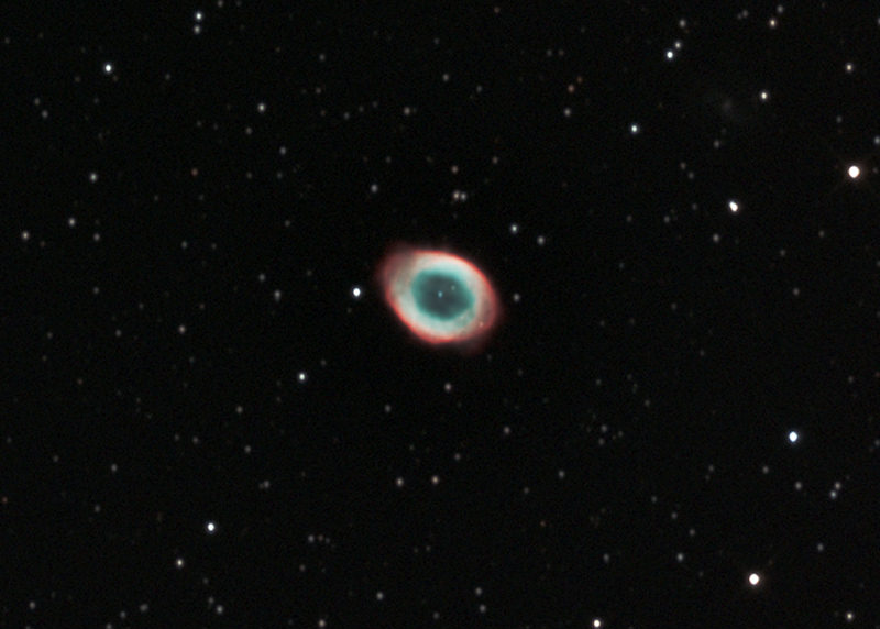 Rob Januszewski pointed out that the star is actually RX Lyrae, which is a Mira type variable star. The magnitude varies from 10.9 to 16.0 over a period of 247.82 days. This prompted me to dig out old images of M57 and look for the star. In each image the star is at the centre. |