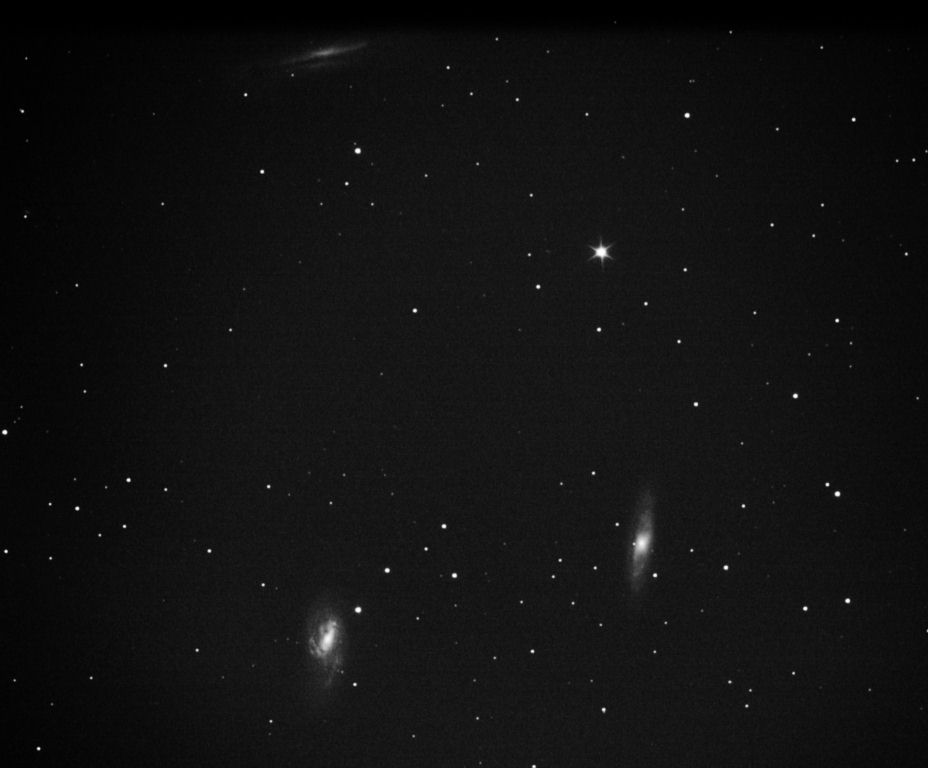 5th March 2009Leo Triplet - M65, M66 and NGC 3628 6" Newtonian, Canon 350D, 84*30seconds. Difficult to image. Converted to greyscale because red channel was very noisy.
