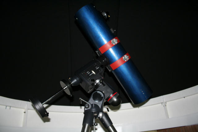 6 inch scope on mount inside the dome. The dome interior has been painted with chalkboard paint to give a smooth non-reflective coating. The camera flash does not show up on it at all so it seems to be doing a good job! |