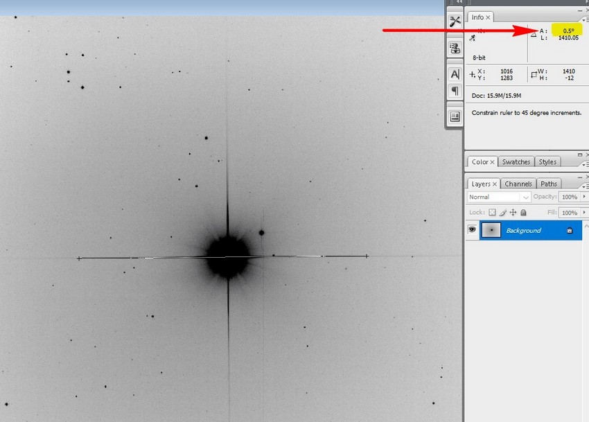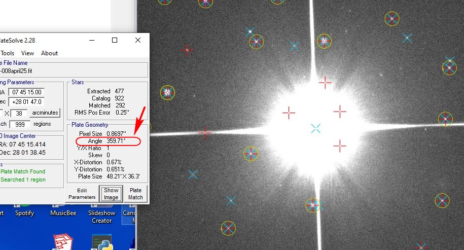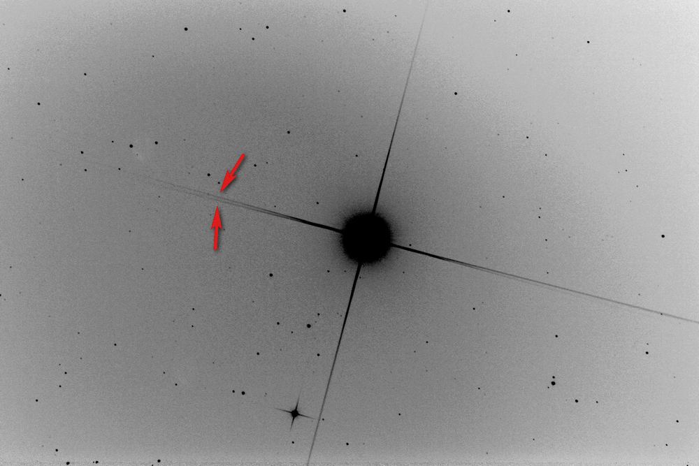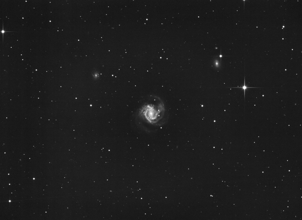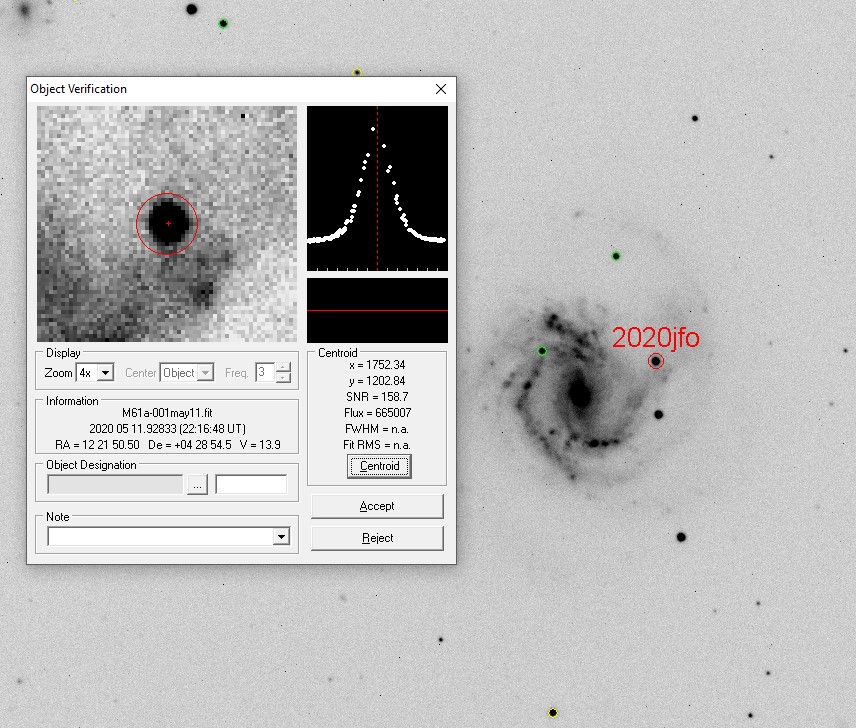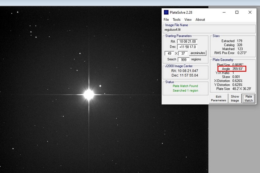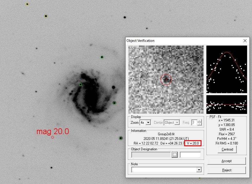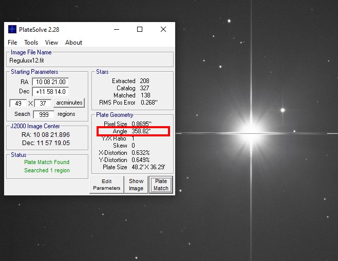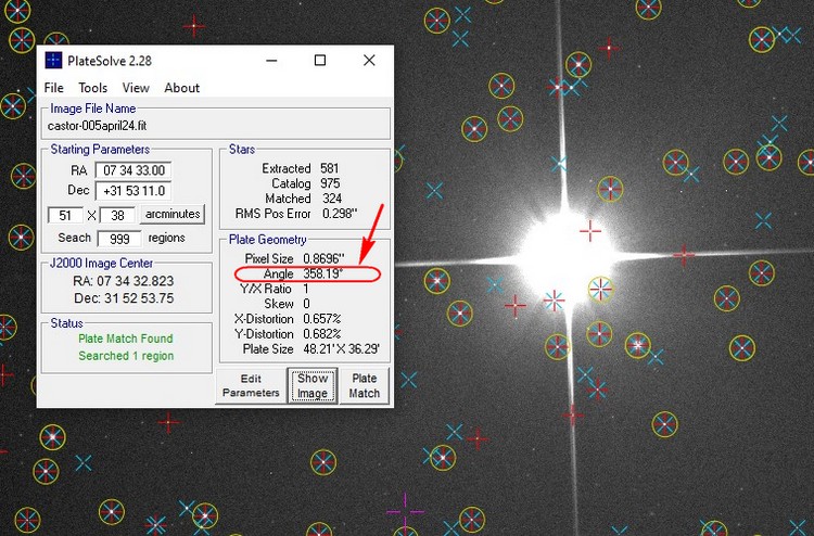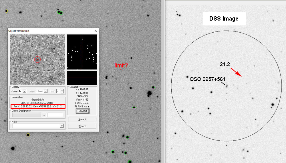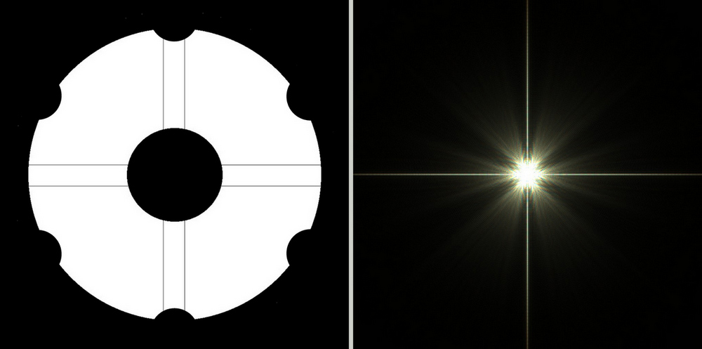 Clearly there is quite a variation in the measured angle - the variations are greater than 0.07 degrees so no advantage gained in trying to improve. M61 with its new supernova - 8 x 600 seconds. ![]() The SN is at magnitude 13.9 ![]() It would appear that the scope can get down to magnitude 20. The 8" struggled at mag19.0. ![]() May 30th On a tip from Mike Merrifield I had a go at the gravitationally lensed quasar - QSO 0957+561 This is 8.7 billion light years away. At magnitude around 17 this was not difficult, but I checked the surrounding area. There is an object that is visible on my image and the DSS image. Astrometrica measured the magnitude at 21.2 which would be a new magnitude record for me. The image is 9 x 600 seconds. ![]() Diffraction artefacts During testing I noticed that bright stars had an unusual diffraction pattern. The pattern was symmetrical, which was a relief, as some scopes tend to make lopsided bright stars. There appeared to be rays at 60 degrees to the horizontal. ![]() After checking the light path for any protuberances that could have caused this, the source was tracked down to the six small retaining clips that hold the primary mirror safe in the cell if the scope accidently points downwards. ![]() I ran a simulation to see what the theoretical output should be: ![]() Clearly if the image was rotated 90 degrees, the diffraction effects would match. In reality only 4 of the 'rays' are seen as 2 are masked by the bright diffraction spikes. May 15th 2021 The scope performed well but for one problem. Focus. The plastic tube is very susceptible to changes in temperature, requiring refocussing after every couple of images. The 8" carbon fibre scope was rock steady, and usually needed to be focused only once per session. I bought a custom made carbon fibre tube - same diameter but a cm or two longer. It is a double walled foam filled tube and is VERY rigid. |