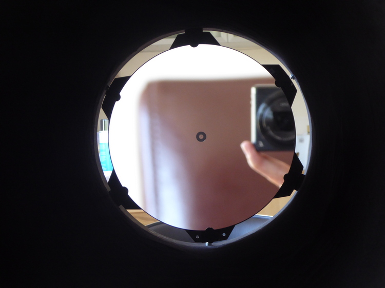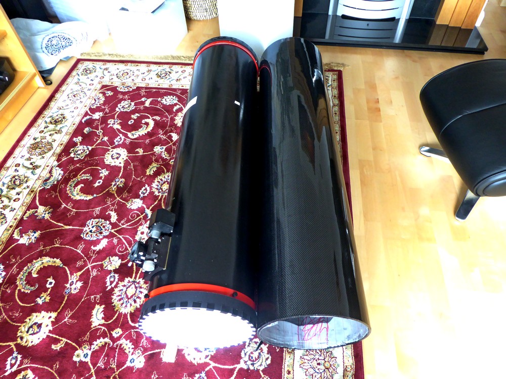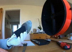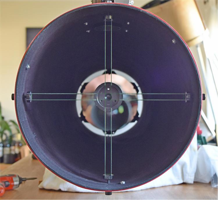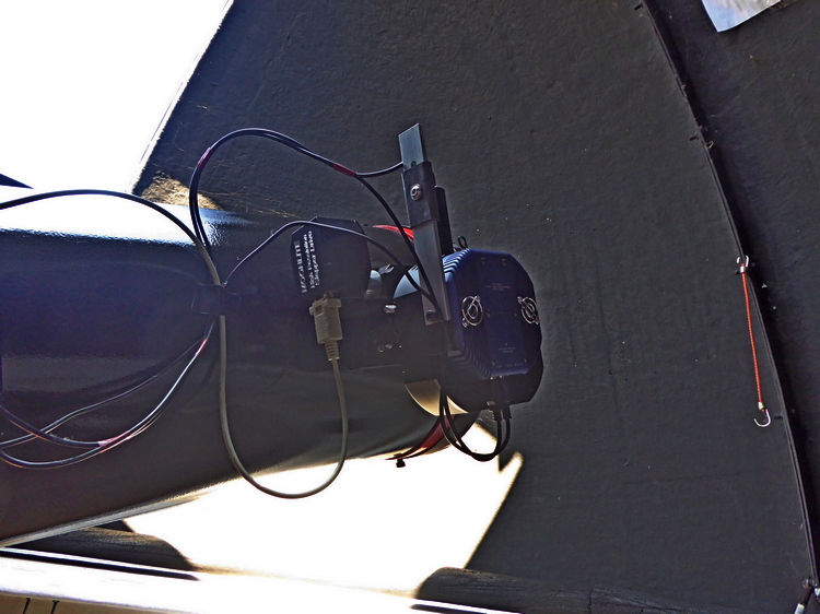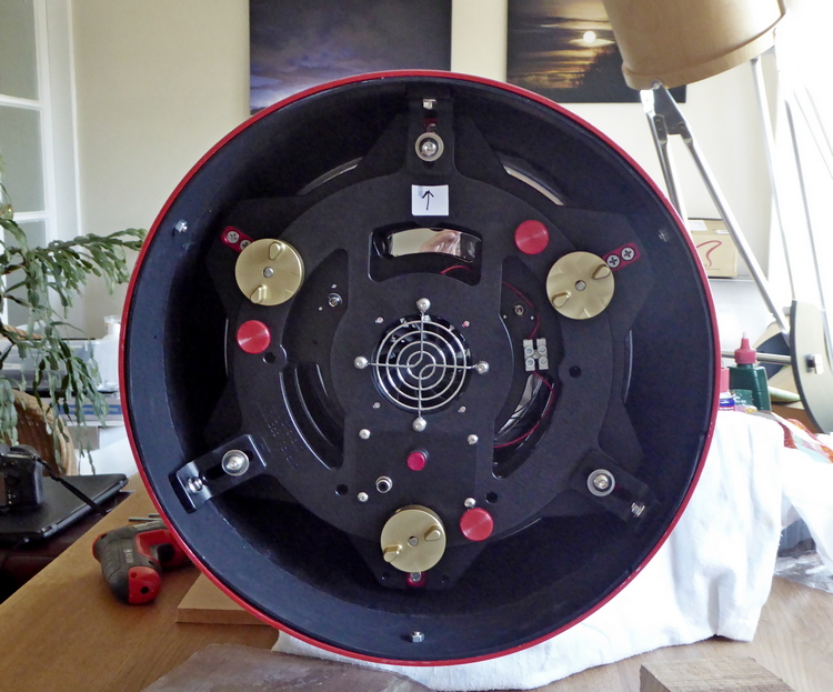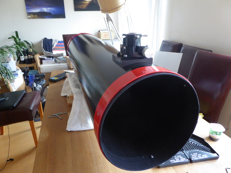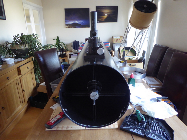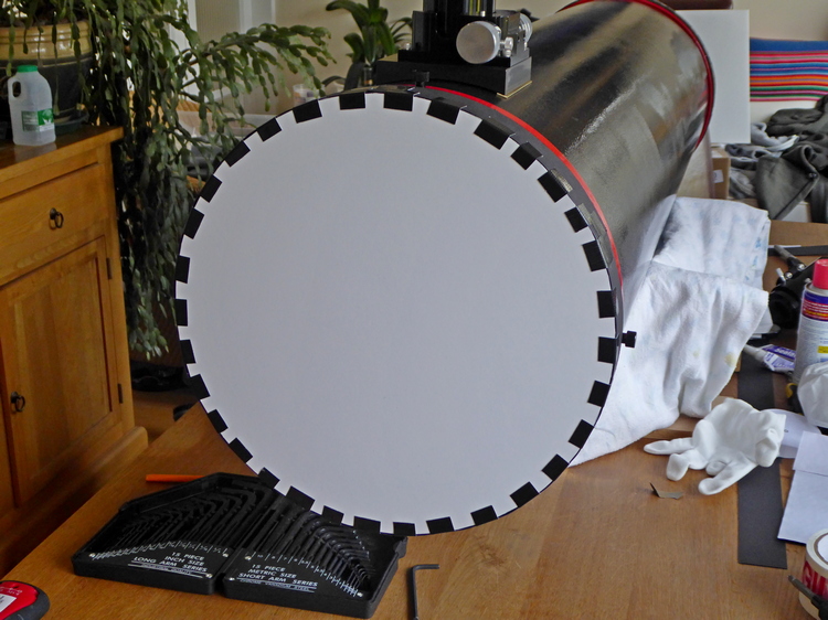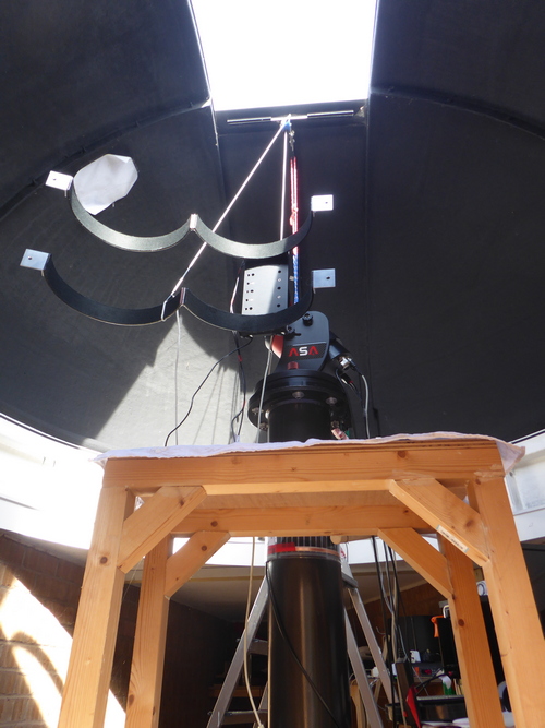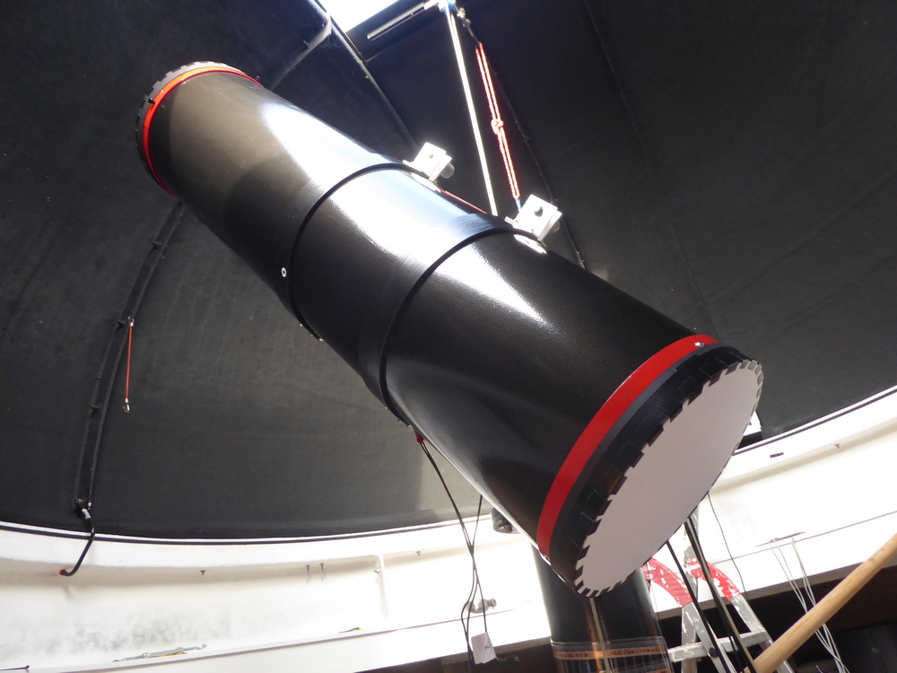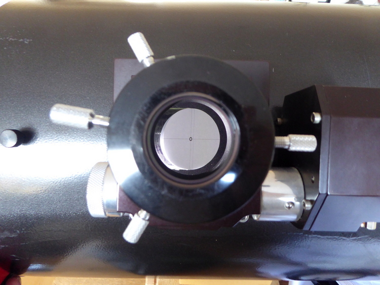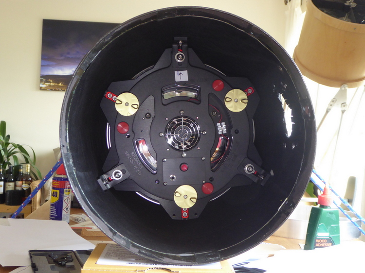 telescope build - Zambuto 10" I ordered a 10" mirror from Carl Zambuto - widely recognised as a superior mirror maker. The surface accuracy of a Zambuto mirror can be around 1/30th the wavelength of light. With mirrors of this quality the image should be perfect, only limited by the seeing conditions. The mirror cell is made by Aurora Precision, optimised for a Zambuto 10". A primary of that quality needs an excellent secondary. This is 3.1" minor axis, at 1/30 wave from Antares Optics. The secondary mirror spider. Carbon fibre vanes. From TS Optics - the Teleskop Service Brand. The spider with a novel mirror support. The steel ellipse is held in place with three neodymium magnets and a central bolt. It will allow very fine alteration of the position of the secondary. The magnets. This video shows the method of attachment of the secondary to the support: link to Youtube Video ---------->> ![]() The assembled secondary. The telescope tube will be from my existing homemade 10". Marking the hole for the focuser with a template. Secondary mirror fitted. The miror in its cell. The primary fitted. Note the old focuser hole to the right. The new scope is f5 - the old one was f6 so the tube will be shorter. It was neater to turn the tube around and cut a new hole for the focuser. Surplus will be cut off when positions are finalised. I use a laser collimator to position the secondary accurately. This template is positioned over the secondary. The laser beam should hit the small circle. Laser collimator in place Laser beam on target - viewed by holding small mirror inside the tube. The view down the focuser tube - looks good - nice and concentric. Collimation - the paper template removed and the laser beam reflects down to the centre of the primary and returns to the laser collimator. I checked focus using a DSLR and the telescope aimed out of an upstairs window. Focus was reached with the focuser racked a bit far outwards. Ideally I want it to be 3mm from its lowest position. Distant trees. Through double glazing so lousy image... This shows the ideal 3mm gap (arrowed), This allow the autofocus routine to move either side of focus. Next step is to check the focus point using the QSI camera. There will be a difference between it and the DSLR position. I placed the scope on its end pointing up through the observatory aperture. Then connected the leads to the camera and took some images. When stars were roughly in focus I set a 130 second exposure. As the stars moved across the sky I altered the focus position by 20 steps, every 10 seconds. The resulting star trails showed the best focus position. (The numerous small dots are hot pixels - I did not bother turning the ccd cooler on for this test.) ![]() Clearly good focus is at position 3680 on the focuser control. This shows the focus position and the 10.8mm that I need to move the primary mirror back down the tube. The stick of wood was the width of the required optimum position. Another clear night so the new focus point checked. Perhaps 2mm from what I was aiming at but this can be adjusted in the final assembly. The old tube cut to size and freshened up with a coat of paint. I was lucky - the old focuser hole did not get in the way! Aluminium strengthening bands for the ends of the tube - painted red: Rings fitted. Outer 3 inches of flocking replaced - the old was a bit tatty. Flocking reflects very little light. Internal reflections will be minimal. Secondary support painted with Black 3.0 - almost totally non-reflective paint. The primary mirror is now in its cell and in situ in the tube. Each fixing point has a series of lines - the trick is to get all 3 points showing the same number of markings. The tube is not perfectly circular, so this required quite a bit of adjustment. However, all three are now exactly the same, at 2 units. It is important to adjust the spider support so that the vanes are exactly perpendicular, otherwise diffraction spikes are split. An accurate 90 template is made from the corner of a foam board. Checked with a photograph overlaid with lines in a CAD program. ![]() When the vanes are not at 90 degree spacings this effect occurs: ![]() Inserting the secondary and rough collimation. Link to video --------->> ![]() End caps made. Very light weight. Foam board, adhesive felt cloth, Gorilla tape. Being in quarantine, getting the new scope onto the mount is a problem. It is a two man job. In the past I have had a friend help. I made a table/stand to put the telescope on (if I can lift it!). The table was then tied to the pier with ropes for added security. Also the mount was held in a suitable orientation with ropes to the dome top. Success. Scope placed upright and tube rings closed. Now to add counterweights... Roughly balanced and table removed. Slight adjustments made to collimation. Previously it was collimated in a horizontal position. In use the scope will never be horizontal. Next job will be to put the CCD camera on and get 'First Light'. QSI camera now in place. The mount is a direct drive ASA DDM60, so needs very accurate balancing. There are no gears - magnetic fields alone control the position and movement of the mount. If it is unbalanced then the electronics is constantly doing extra work to hold it in place. Setting up the scope - link to video -----> First light April 24th 2020 This is 8 x 60 seconds on Castor ![]() Negative image ![]() First impressions are good. Stars are round. Diffraction around Castor is symmetrical with no weird flaring. Stars at the right of the frame less round - this could be due to camera tilt. 4 x 600 seconds of M65 and M66 ![]() Some tweeks. The images last night were not aligned with North exactly vertical. The secondary vanes will make diffraction spikes on bright stars. My intention is to get those spikes aligned NSEW. ![]() Platesolving an image shows a rotation angle of 358.19 The platesolve also gives useful data such as plate size, pixel size etc. ![]() There are two th