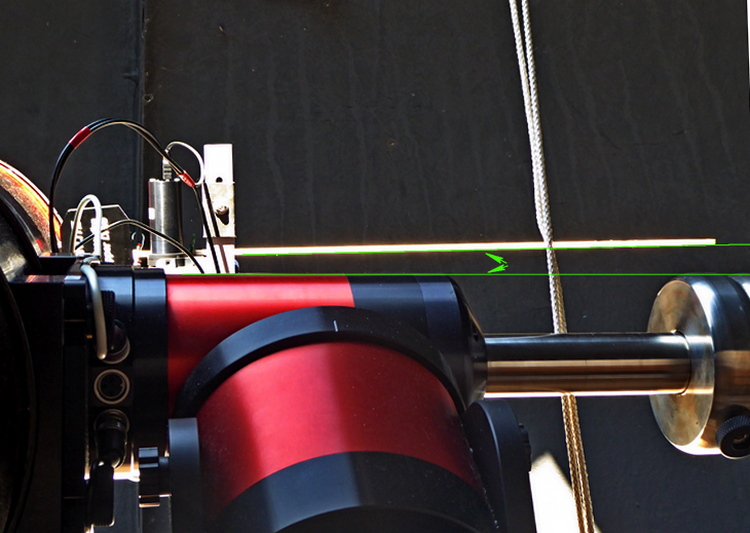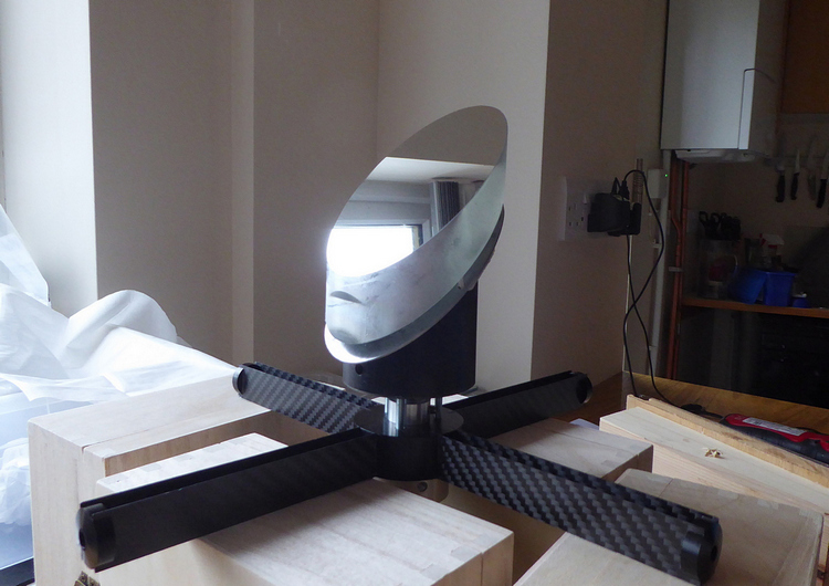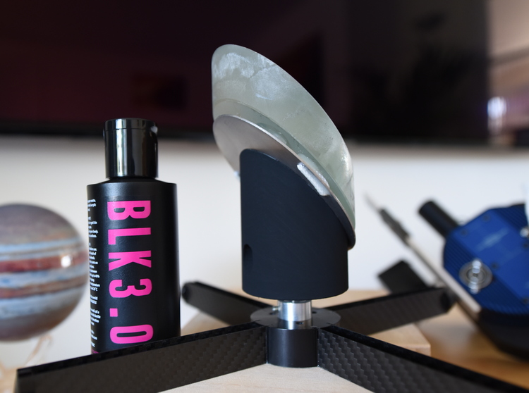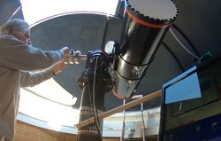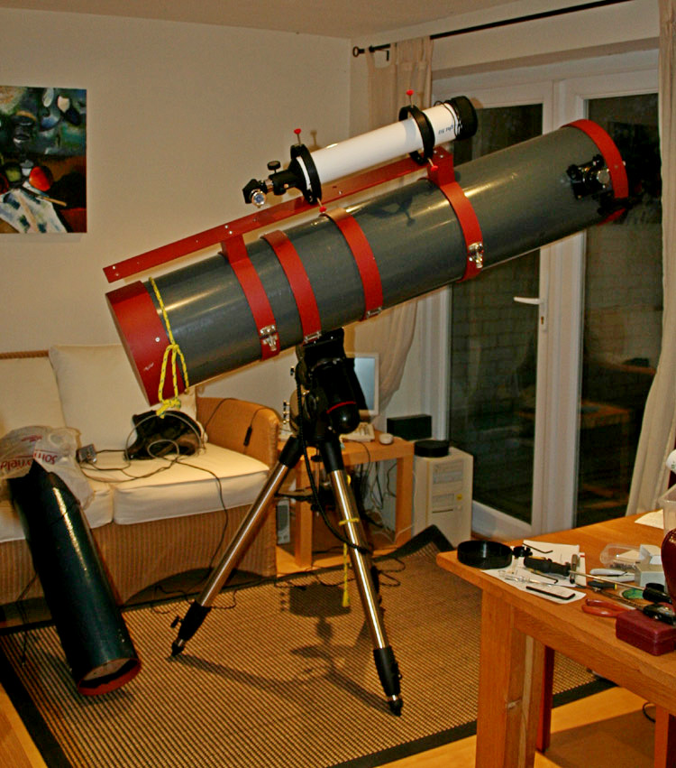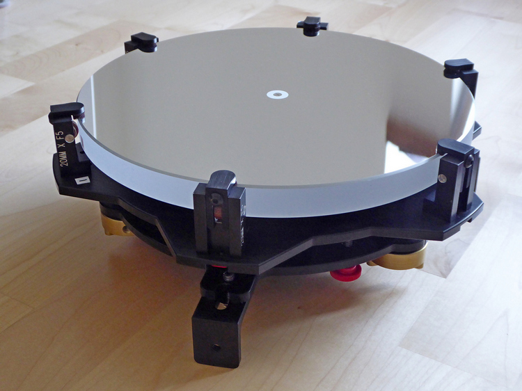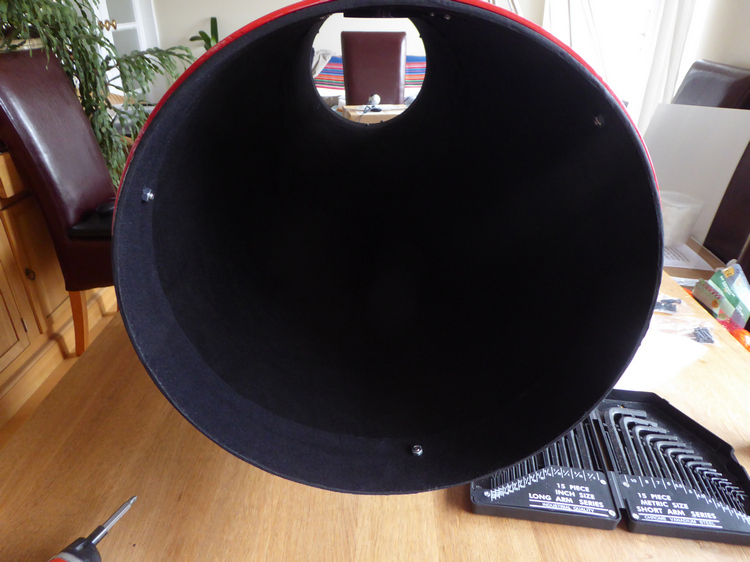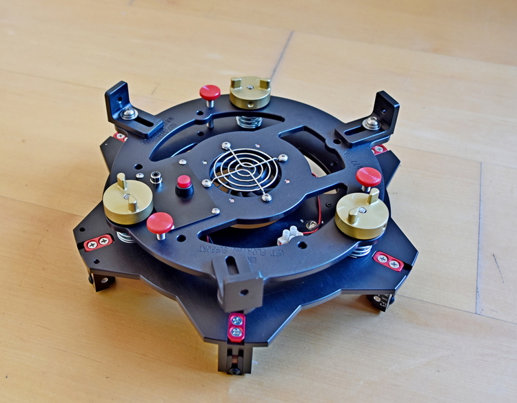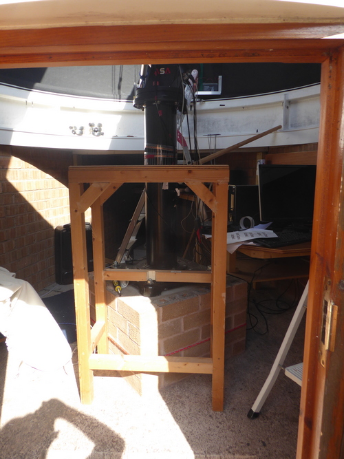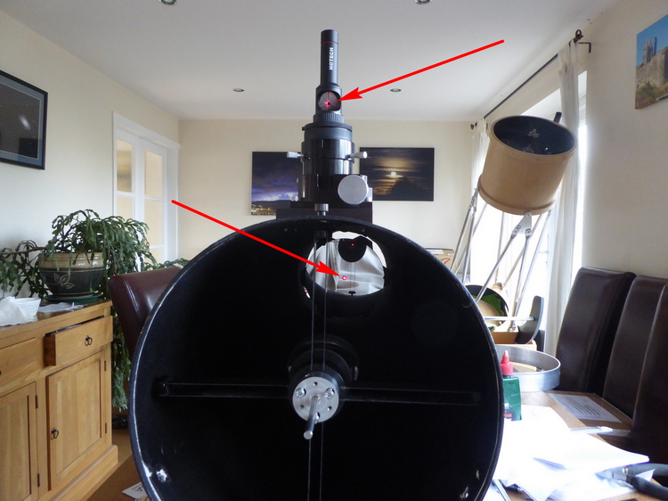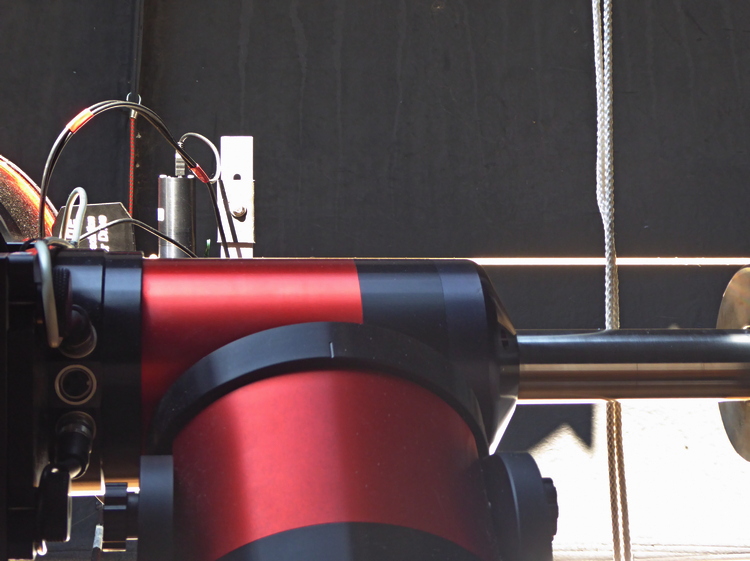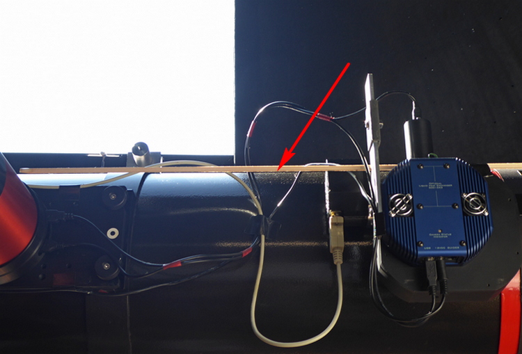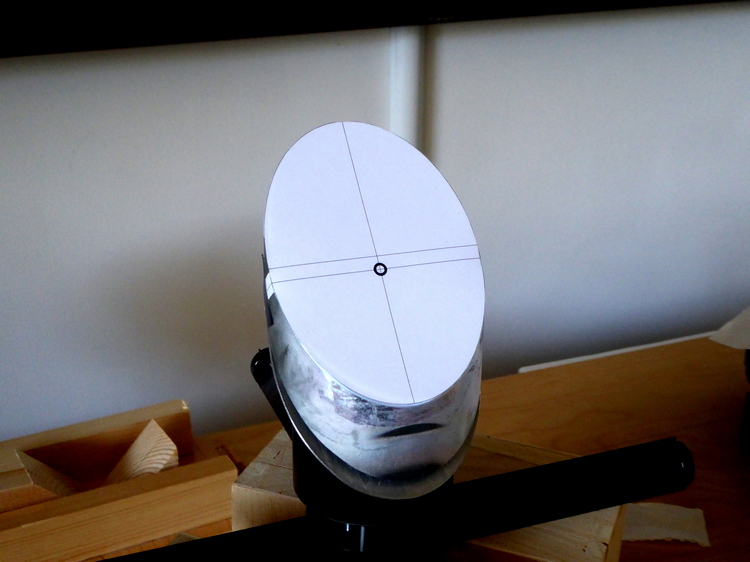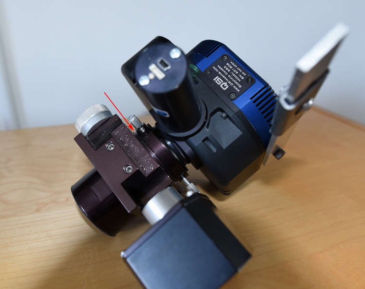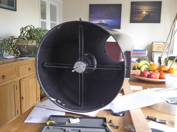 telescope build - Zambuto 10" I ordered a 10" mirror from Carl Zambuto - widely recognised as a superior mirror maker. The surface accuracy of a Zambuto mirror can be around 1/30th the wavelength of light. With mirrors of this quality the image should be perfect, only limited by the seeing conditions. The mirror cell is made by Aurora Precision, optimised for a Zambuto 10". A primary of that quality needs an excellent secondary. This is 3.1" minor axis, at 1/30 wave from Antares Optics. The secondary mirror spider. Carbon fibre vanes. From TS Optics - the Teleskop Service Brand. The spider with a novel mirror support. The steel ellipse is held in place with three neodymium magnets and a central bolt. It will allow very fine alteration of the position of the secondary. The magnets. This video shows the method of attachment of the secondary to the support: link to Youtube Video ---------->> ![]() The assembled secondary. The telescope tube will be from my existing homemade 10". Marking the hole for the focuser with a template. Secondary mirror fitted. The miror in its cell. The primary fitted. Note the old focuser hole to the right. The new scope is f5 - the old one was f6 so the tube will be shorter. It was neater to turn the tube around and cut a new hole for the focuser. Surplus will be cut off when positions are finalised. I use a laser collimator to position the secondary accurately. This template is positioned over the secondary. The laser beam should hit the small circle. Laser collimator in place Laser beam on target - viewed by holding small mirror inside the tube. The view down the focuser tube - looks good - nice and concentric. Collimation - the paper template removed and the laser beam reflects down to the centre of the primary and returns to the laser collimator. I checked focus using a DSLR and the telescope aimed out of an upstairs window. Focus was reached with the focuser racked a bit far outwards. Ideally I want it to be 3mm from its lowest position. Distant trees. Through double glazing so lousy image... This shows the ideal 3mm gap (arrowed), This allow the autofocus routine to move either side of focus. Next step is to check the focus point using the QSI camera. There will be a difference between it and the DSLR position. I placed the scope on its end pointing up through the observatory aperture. Then connected the leads to the camera and took some images. When stars were roughly in focus I set a 130 second exposure. As the stars moved across the sky I altered the focus position by 20 steps, every 10 seconds. The resulting star trails showed the best focus position. (The numerous small dots are hot pixels - I did not bother turning the ccd cooler on for this test.) ![]() Clearly good focus is at position 3680 on the focuser control. This shows the focus position and the 10.8mm that I need to move the primary mirror back down the tube. The stick of wood was the width of the required optimum position. Another clear night so the new focus point checked. Perhaps 2mm from what I was aiming at but this can be adjusted in the final assembly. The old tube cut to size and freshened up with a coat of paint. I was lucky - the old focuser hole did not get in the way! Aluminium strengthening bands for the ends of the tube - painted red: Rings fitted. Outer 3 inches of flocking replaced - the old was a bit tatty. Flocking reflects very little light. Internal reflections will be minimal. Secondary support painted with Black 3.0 - almost totally non-reflective paint. The primary mirror is now in its cell and in situ in the tube. Each fixing point has a series of lines - the trick is to get all 3 points showing the same number of markings. The tube is not perfectly circular, so this required quite a bit of adjustment. However, all three are now exactly the same, at 2 units. It is important to adjust the spider support so that the vanes are exactly perpendicular, otherwise diffraction spikes are split. An accurate 90 template is made from the corner of a foam board. Checked with a photograph overlaid with lines in a CAD program. ![]() When the vanes are not at 90 degree spacings this effect occurs: ![]() Inserting the secondary and rough collimation. Link to video --------->> ![]() End caps made. Very light weight. Foam board, adhesive felt cloth, Gorilla tape. Being in quarantine, getting the new scope onto the mount is a problem. It is a two man job. In the past I have had a friend help. I made a table/stand to put the telescope on (if I can lift it!). The table was then tied to the pier with ropes for added security. Also the mount was held in a suitable orientation with ropes to the dome top. Success. Scope placed upright and tube rings closed. Now to add counterweights... Roughly balanced and table removed. Slight adjustments made to collimation. Previously it was collimated in a horizontal position. In use the scope will never be horizontal. Next job will be to put the CCD camera on and get 'First Light'. QSI camera now in place. The mount is a direct drive ASA DDM60, so needs very accurate balancing. There are no gears - magnetic fields alone control the position and movement of the mount. If it is unbalanced then the electronics is constantly doing extra work to hold it in place. Setting up the scope - link to video -----> First light April 24th 2020 This is 8 x 60 seconds on Castor ![]() Negative image ![]() First impressions are good. Stars are round. Diffraction around Castor is symmetrical with no weird flaring. Stars at the right of the frame less round - this could be due to camera tilt. 4 x 600 seconds of M65 and M66 ![]() Some tweeks. The images last night were not aligned with North exactly vertical. The secondary vanes will make diffraction spikes on bright stars. My intention is to get those spikes aligned NSEW. ![]() Platesolving an image shows a rotation angle of 358.19 The platesolve also gives useful data such as plate size, pixel size etc. ![]() There are two th