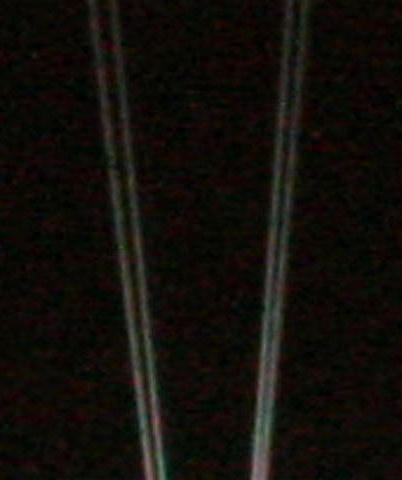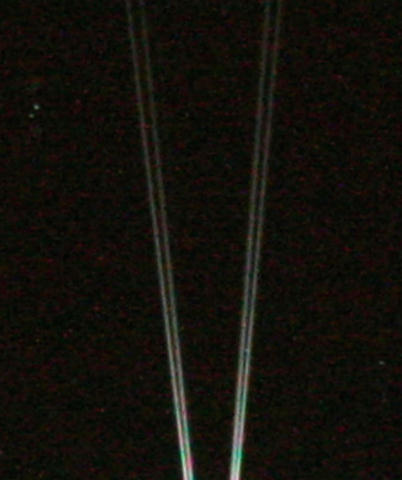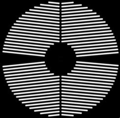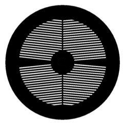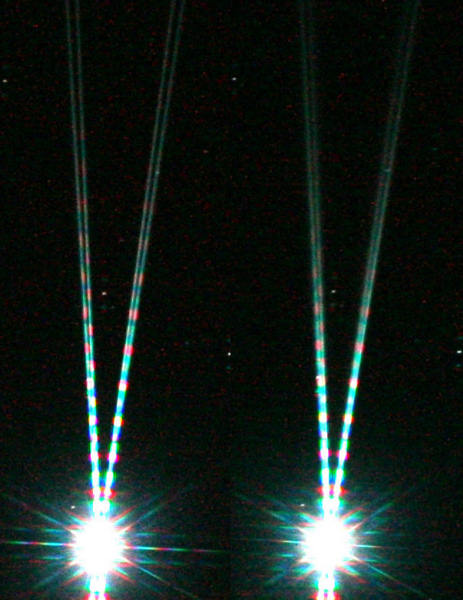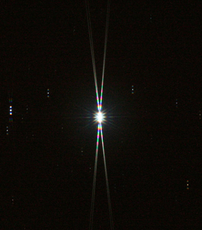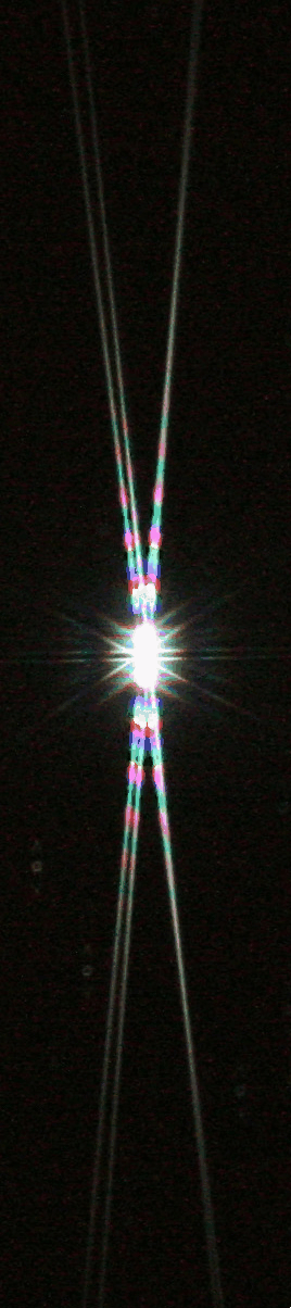 26th March 2009 The Bahtinov Mask requires you to judge when the central spike is midway between the two angle spikes. This is quite easy to do, but there is still a little uncertainty in determining the exact centre alignment, especially when viewing in a DSLR viewfinder. After some experimentation, I have come up with this mask, which is perhaps different enough from the Bahtinov mask to warrant a new name. The central spike idea has been abandoned. The angle between spikes has been considerably reduced. Instead of two sloping sets of slits and one central set, there are four sets of slits, with a small angle difference on each side of the mask. In the prototype I used 10 degrees and 12 degrees.