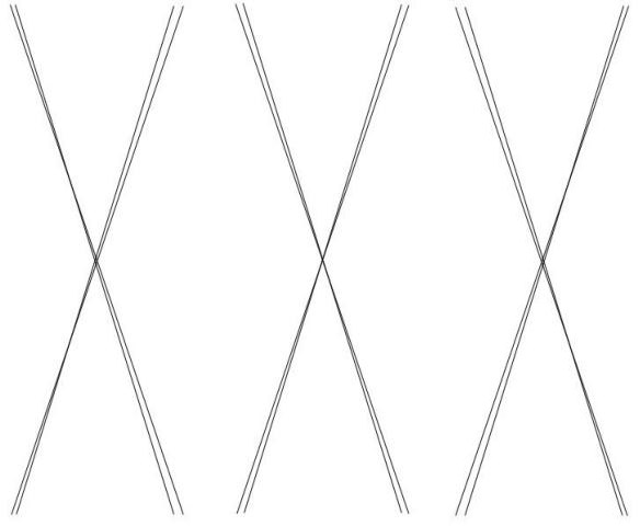 The diffraction pattern produced is two overlapping 'X' shapes, with slightly differing angles. At perfect focus the Xs will be symmetrical. Inside and outside focus the Xs will be displaced. Because the angle of each X is slightly different, it will be easy to spot when out of focus, and also which way focus should be altered.